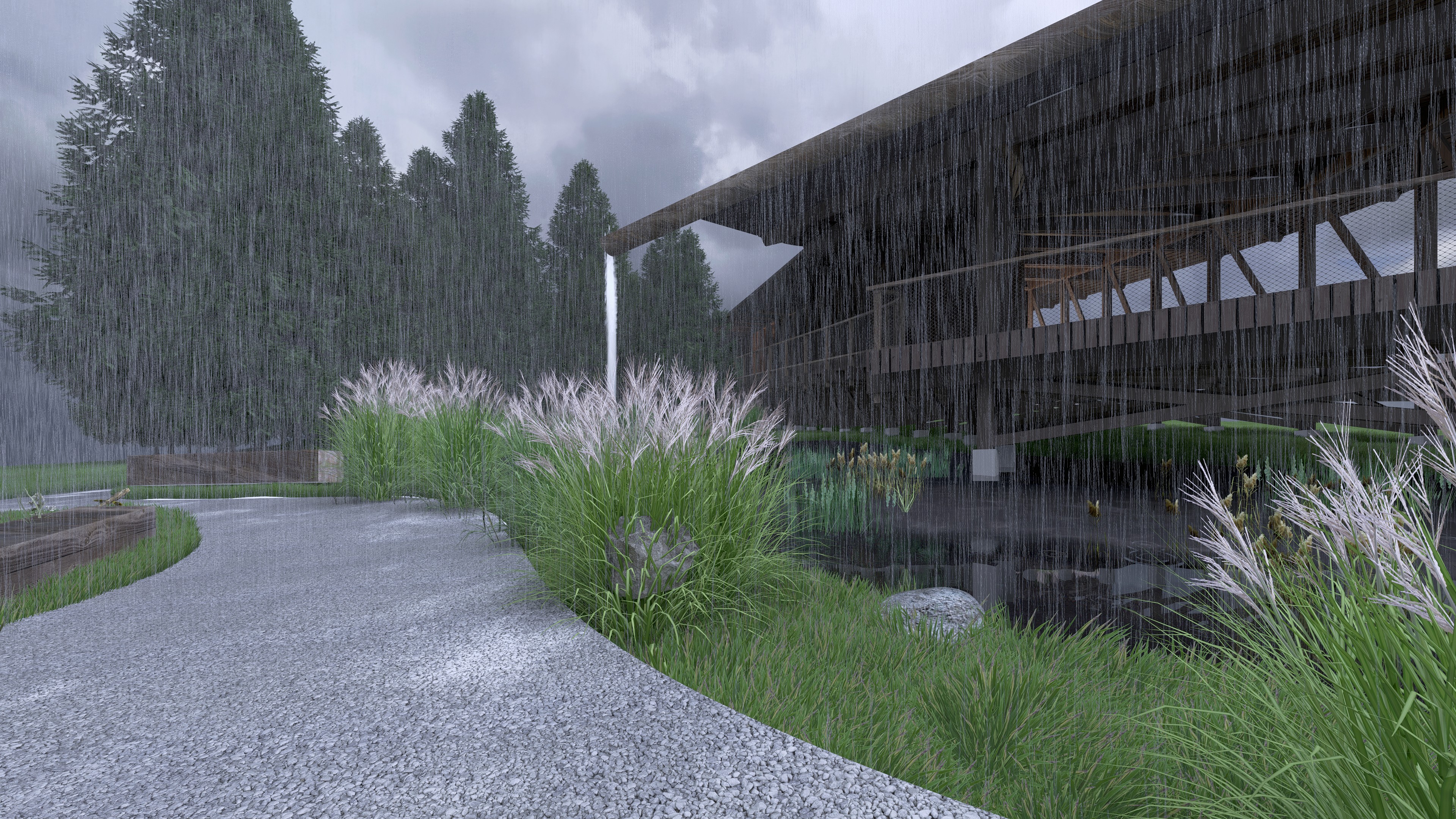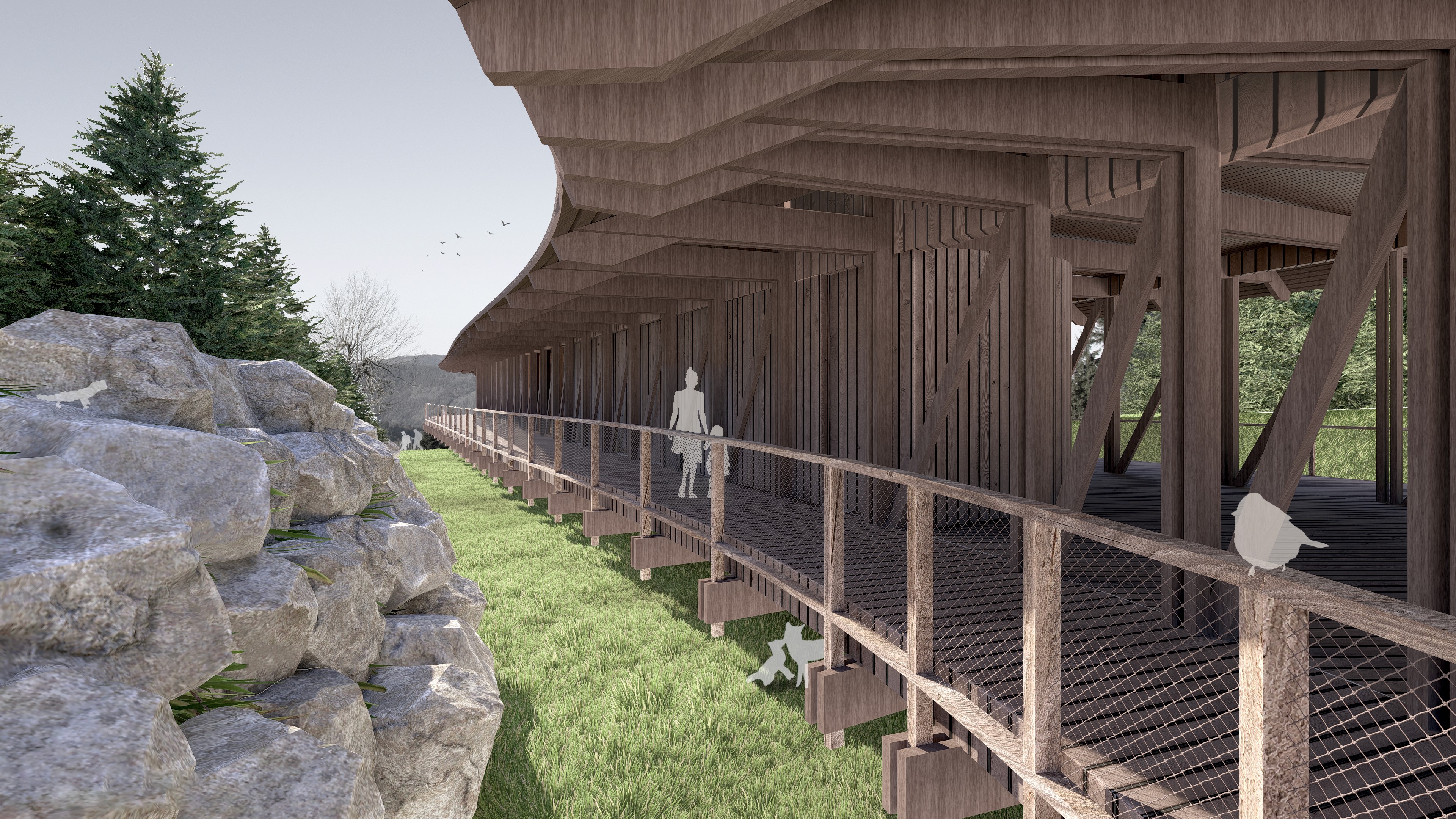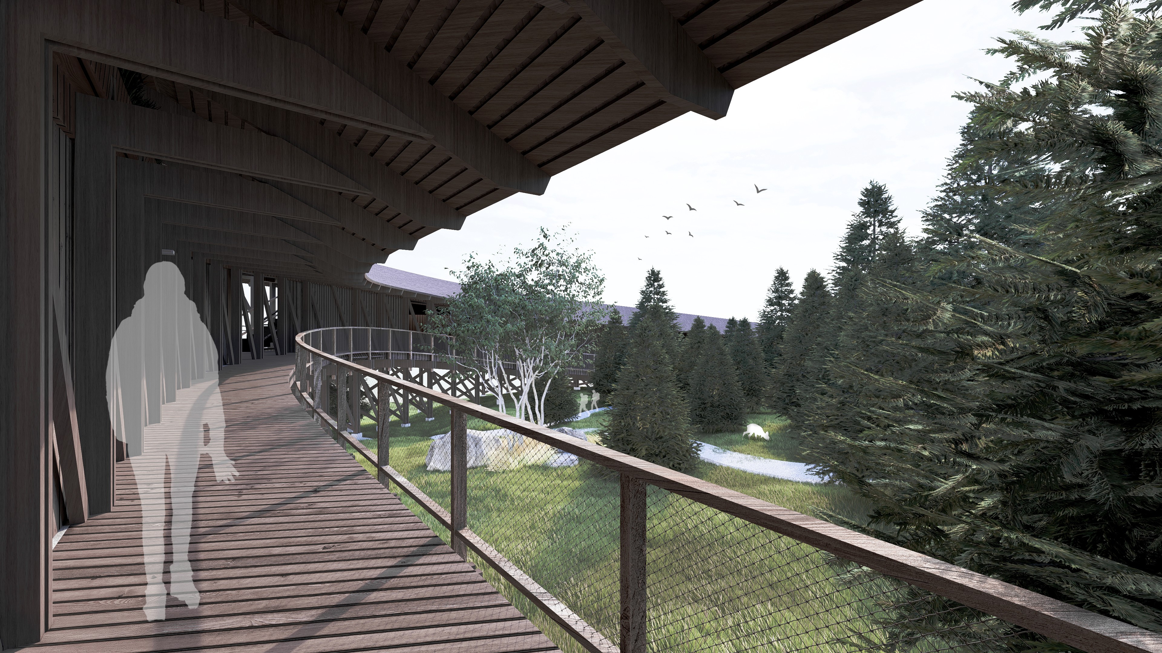 Dachform, Materialität und räumliche Öffnungen greifen Motive dieser regionalen Baukultur auf und übersetzen sie in eine zeitgemäße architektonische Sprache. So entsteht ein Bauwerk, das sich behutsam in seine Umgebung einfügt und Architektur als Bindeglied zwischen Landschaft, Nutzung und kulturellem Kontext versteht.